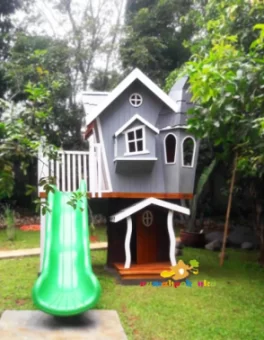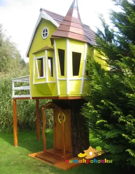 Rumah pohon tipe Witch craft ini paling banyak disukai karena bentuknya yang unik dan warnanya yang cerah. Anak dapat masuk ke rumah melalui pintu di batang pohon yang di dalamnya terdapat tangga naik. Witch craft treehouse ini dapat menjadi daya tarik tersendiri untuk taman di rumah atau tempat usaha Anda.