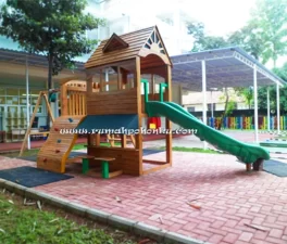 *Harga Hubungi CSPlayground Simple playfort 8 ini dibuat untuk sekolah Cita Buana Jagakarsa. Permainan di playground ini terdiri dari rumah kayu dengan teras berisi tangga naik dan panjat dinding. Di bagian bawah rumah kayu terdapat store panel dengan tenda kecil dan dua tempat duduk dengan meja mini untuk permainan pura-pura berjualan.